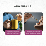 Nehmen Sie täglich 10 Tropfen in einem Glas Wasser oder Fruchtsaft ein. Für die beste Wirkung empfiehlt sich die Einnahme während einer Mahlzeit.